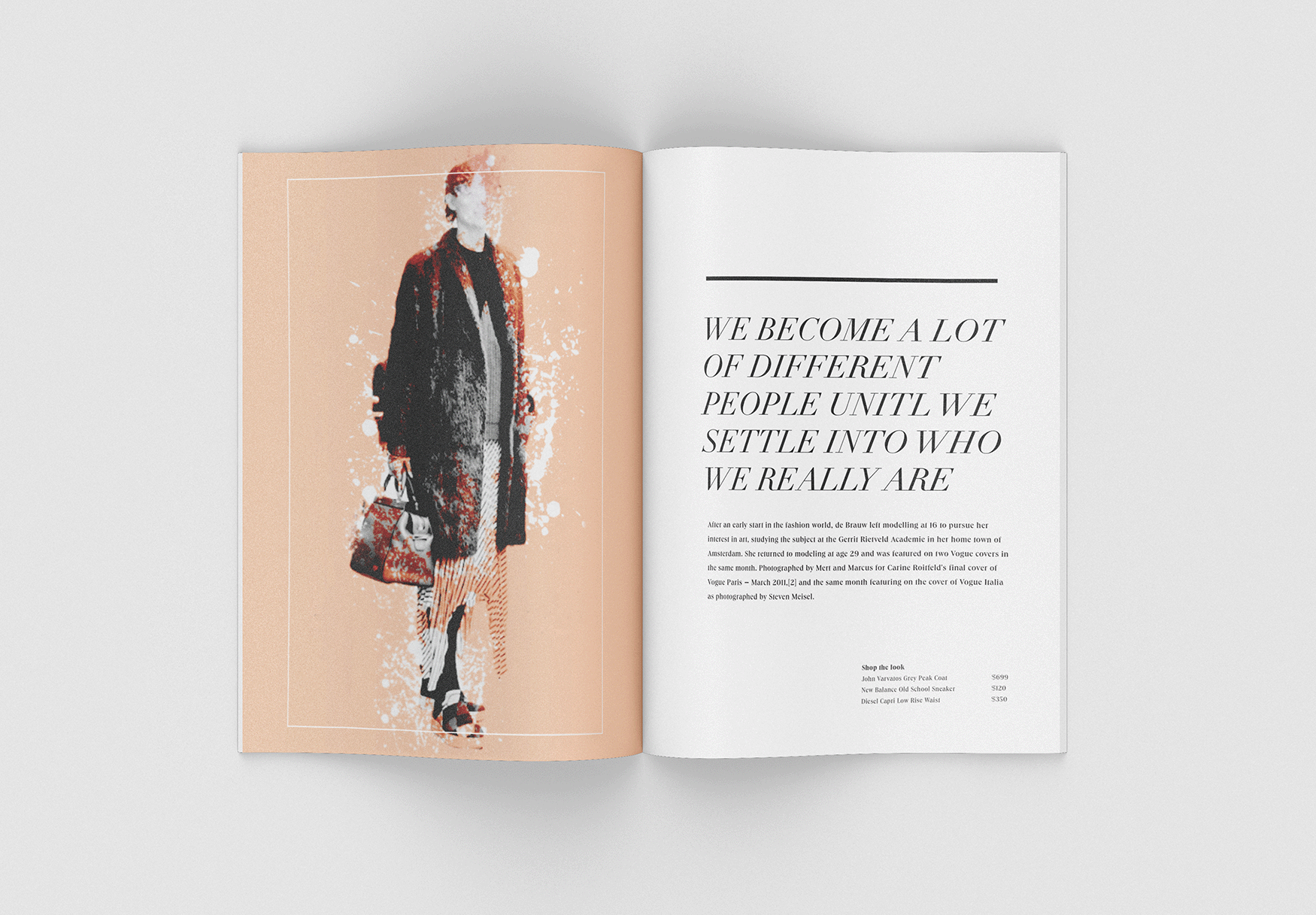Anonymity explores the tension between exposure and concealment. Each spread pairs a real interview — rewritten in a poetic, melancholic voice — with fashion photography where the subject's identity dissolves behind paint splatter and mixed media textures. The editorial balances intimacy with anonymity, letting readers connect with the words without ever seeing a face. A 'shop the look' section grounds each spread in something tangible — brand, garment, price — bridging raw storytelling with commercial fashion editorial.